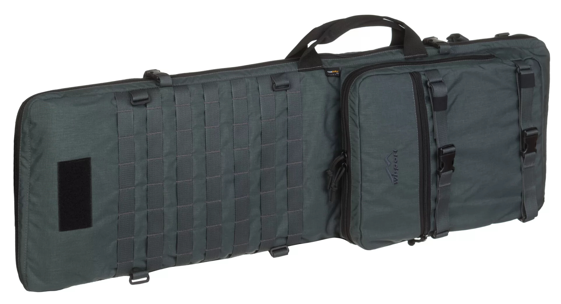 Na zewnętrznej ściance pokrowiec posiada panel zgodny z system PALS oraz płaską kieszeń na dodatkowy ekwipunek (tarcze, amunicję, akcesoria do broni itd.)