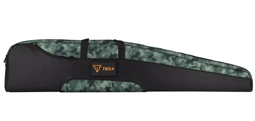 Torba na broń Sako/Tikka w zielony kamuflażu cyfrowym jest wyściełana i pasuje do karabinów o długości do 127 cm i szerokości 25 cm. Posiada odpinany pasek na ramię z wyściełaną częścią, uchwyt do noszenia oraz dużą zewnętrzną kieszeń zapinaną na zamek błyskawiczny.