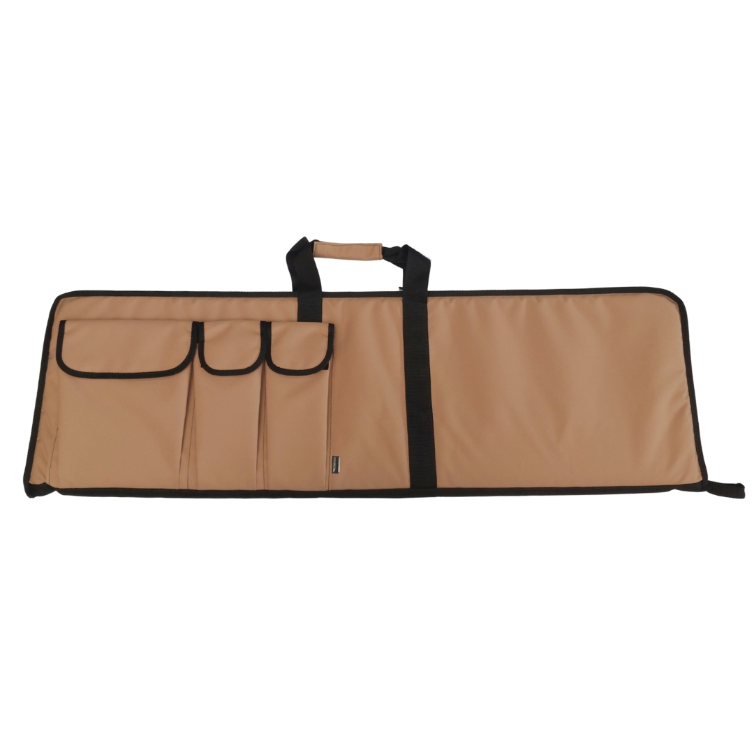 Wnętrze pokrowca zostało wyściełane miękką gąbką, która skutecznie amortyzuje wstrząsy i chroni broń przed zarysowaniami. Na zewnątrz znajdziemy trzy praktyczne kieszenie na akcesoria – idealne na magazynki, narzędzia czy drobne wyposażenie. Dwie z nich to podłużne kieszenie z zakładkami, zapinane na rzep, które dopasowują się do zawartości. Trzecia, również zamykana na rzep, jest pojemna i funkcjonalna.