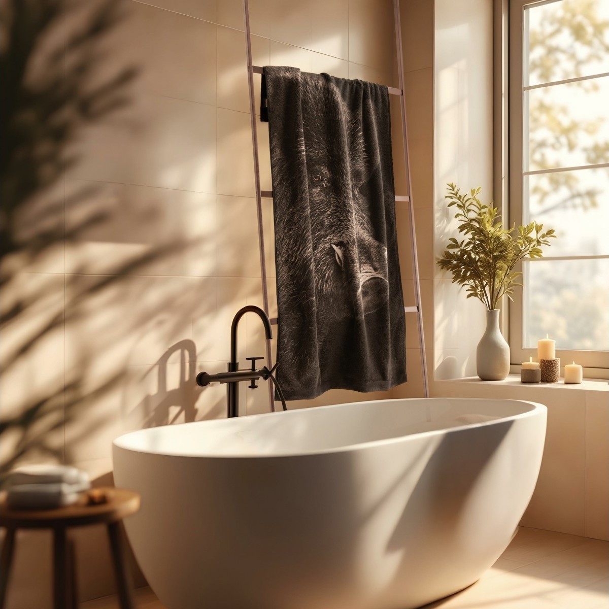 Wprowadź do swojej łazienki odrobinę dzikiej, naturalnej energii. Ręcznik DZIK to propozycja dla osób, które cenią autentyczne wzornictwo oraz wyraziste detale inspirowane światem przyrody. Realistyczny nadruk przedstawiający potężną sylwetkę dzika przyciąga uwagę i nadaje wnętrzu wyjątkowego charakteru. Stonowana, elegancka kolorystyka w odcieniach czerni i brązu podkreśla jego surowe, leśne oblicze.