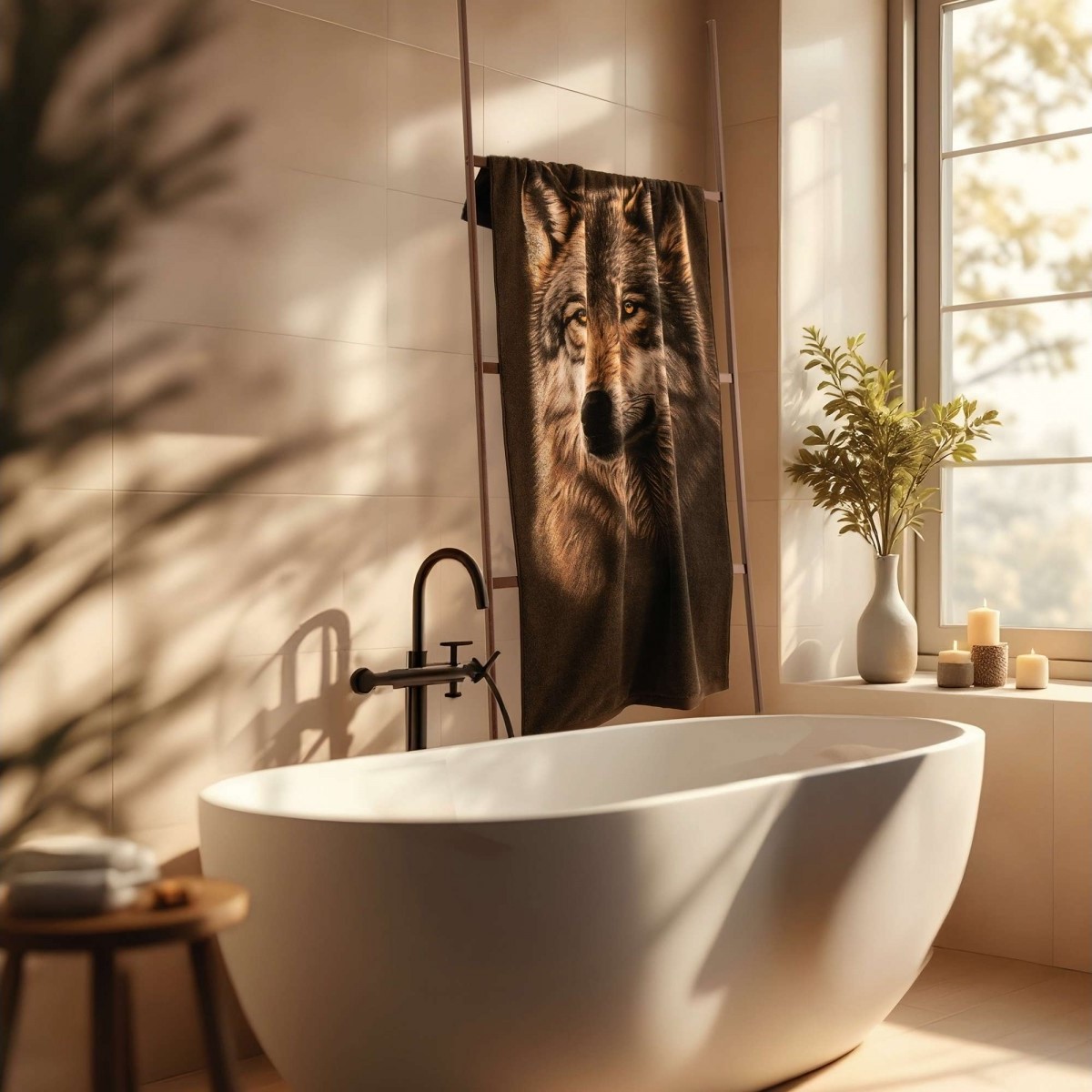 Odkryj elegancję inspirowaną dziką naturą. Ręcznik WILK to propozycja dla osób, które chcą wprowadzić do swojej łazienki nieco tajemniczości i szlachetności. Realistyczny wizerunek wilka, oddany z dbałością o detale, przyciąga uwagę i nadaje ręcznikowi wyjątkowy charakter. Ciepła, naturalna kolorystyka podkreśla harmonijny, przytulny klimat wnętrza.