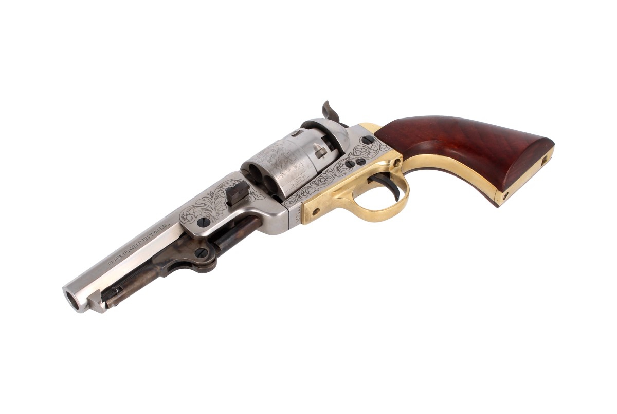 Colt 1851 Navy Yank Sheriff Yankee kal. 44 - YEE44, zaprojektowany przez Samuela Colta sześciostrzałowy kapiszonowy rewolwer czarnoprochowy ładowany odprzodowo z ramą stalową stainless steel.