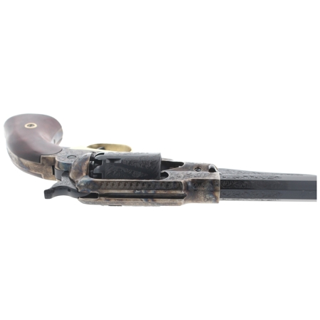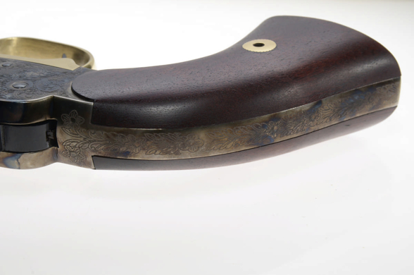 1858 New Model Army .44 - kunsztownie wykonana grawerowana wersja DeLux kapiszonowego rewolweru czarnoprochowego Remington w kalibrze .44. Ten wyjątkowy model stworzony, nie tylko do strzelania pokryto grawerowanymi ozdobnymi ornamentami roślinnymi wykonanymi na ramie, lufie, pobojczyku, kurku, osłonie spustu, okuciu chwytu oraz cylindrze bębna. Uwaga! umieszczone na stronie zdjęcia produktu nie oddają w pełni piękna i jakości wykonanego grawerunku.