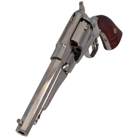 1858 Remington Texas Nickel .36, sześciostrzałowy kapiszonowy rewolwer czarnoprochowy w kalibrze .36 w wersji niklowanej. Ładowany odprzodowo z ramą mosiężną i lufą 6.5 cala. Broń pokryta niklem jest łatwiejsza do czyszczenia po odbytym strzelaniu.