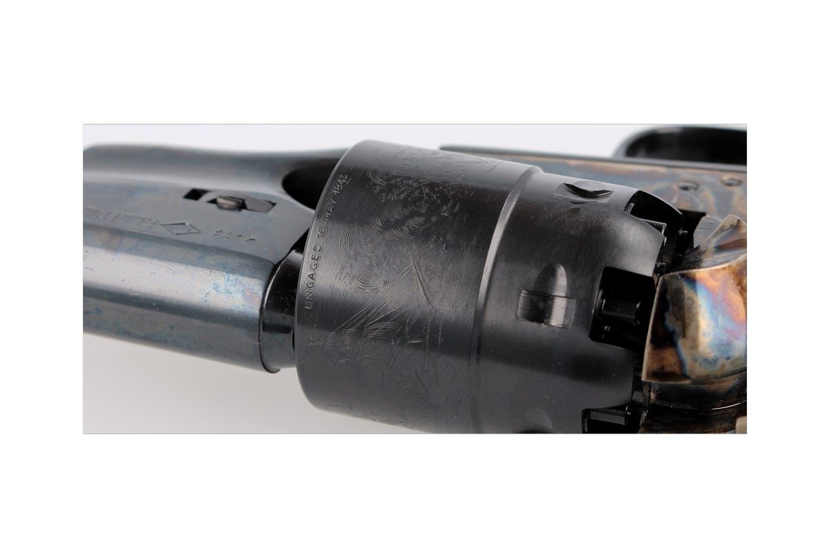 1862 Colt Pocket Police Snubnose .44 z ergonomicznym chwytem Thunderer z okładzinami o ryflowanej strukturze (Checkered Grip). Najlepszy rewolwer do szybkiego dobycia oraz strzelania na małych dystansach: krótka lufa, poręczna rękojeść Thunderer. Na cylindrze bębna wygrawerowana scena zwycięstwa II Texas Navy w bitwie pod Campeche w roku 1843.