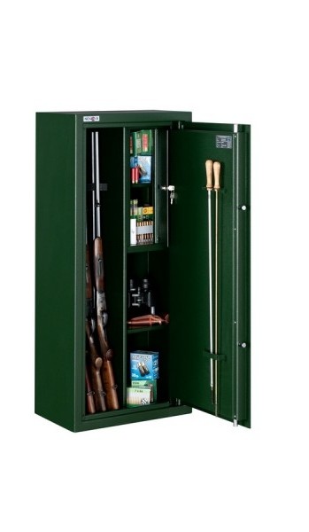 Szafa na broń z certyfikatem S1, model G-3/S1/4, firmy Novcan przeznaczona jest do bezpiecznego przechowywania do 4 jednostek myśliwskiej broni długiej, a głębokość szafy 350 mm, pozwala na swobodne przechowywanie każdej broni długiej z zamontowaną lunetą.
