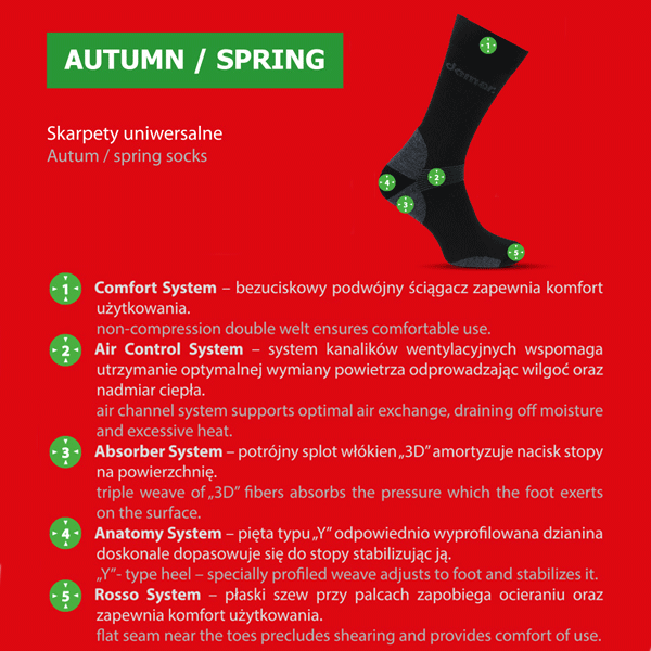 | Bezuciskowy, podwójny ściągacz zapewnia komfort użytkowania, Pięta typu „Y“ - odpowiednio wyprofilowana dzianina doskonale dopasowuje się do stopy stabilizując ją, miejsce wzbogacone o KEVLAROWĄ strefę wzmocnienia, System kanalików wentylacyjnych, wspomaga utrzymanie optymalnej wymiany powietrza odprowadzając wilgoć oraz nadmiar ciepła, Płaski szew przy palcach zapobiega ocieraniu oraz zapewnia komfort użytkowania, miejsce wzbogacone o KEVLAROWĄ strefę wzmocnienia, Potrójny splot włókien „3D“ amortyzuje nacisk stopy na powierzchnię |