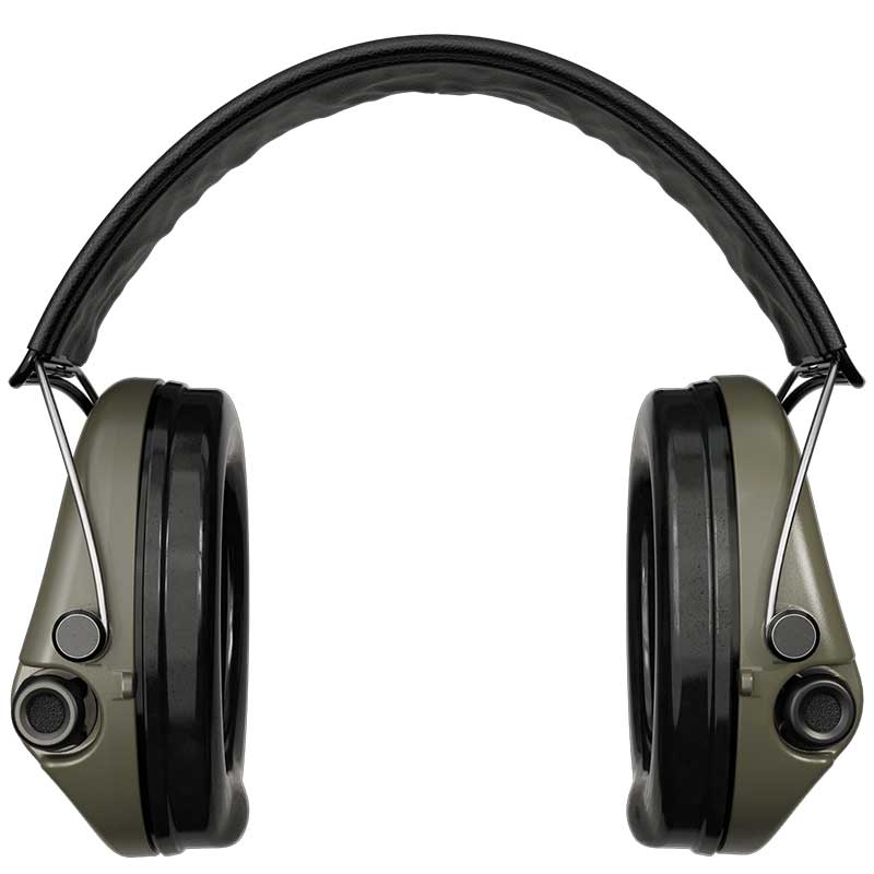 Wyprodukowane przez szwedzką firmę MSA Sordin słuchawki z aktywną ochroną słuchu SOR75302-S, z czarną skórzaną opaską, zielonymi kubkami oraz piankowymi wkładkami.