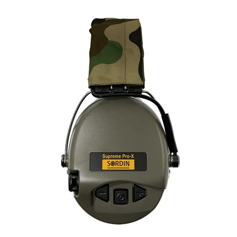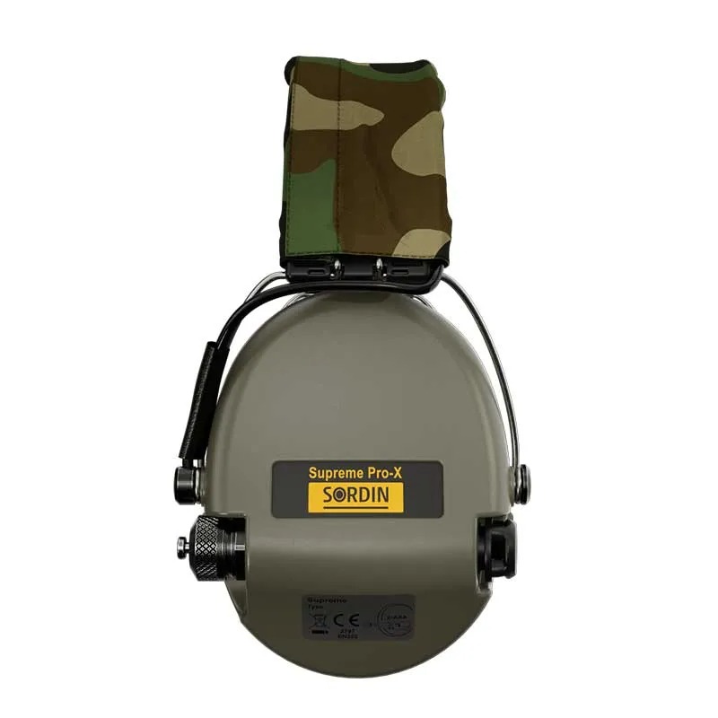 Wyprodukowane przez szwedzką firmę MSA Sordin słuchawki z aktywną ochroną słuchu Sordin Supreme Pro X, z opaską camo, zielonymi kubkami oraz żelowymi wkładkami, oznaczone przez producenta kodem SOR75302-X-G-S.