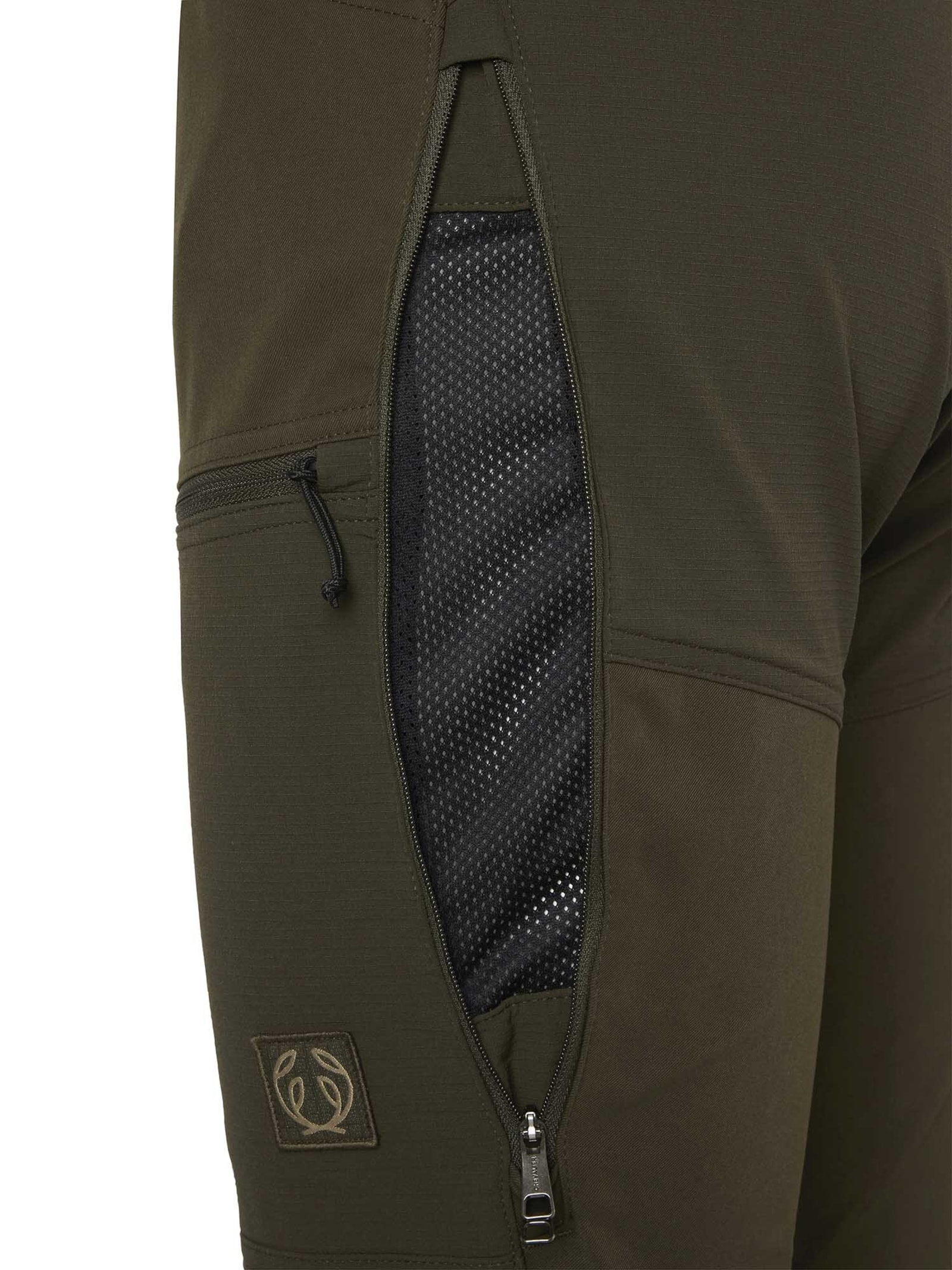 Spodnie wyposażone są w dwie pojemne kieszenie cargo z zakładkami i zamkami, z których jedna zawiera dodatkową kieszonkę na telefon. Boczne zamki wentylacyjne z siateczką umożliwiają regulację przewiewności w cieplejsze dni lub przy większym wysiłku. Elastyczne, regulowane nogawki z rzepami oraz ukryty haczyk do przypięcia do butów zapewniają doskonałe dopasowanie do obuwia outdoorowego.