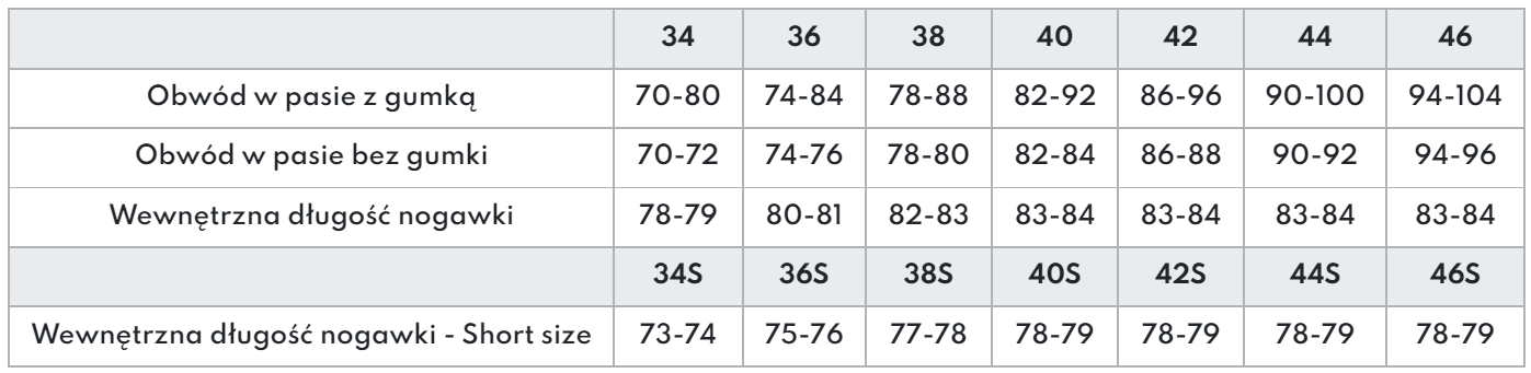 Elastyczny pas. Zakończenia nogawek mają zamek błyskawiczny, można je również regulować za pomocą rzepu. Damski krój.