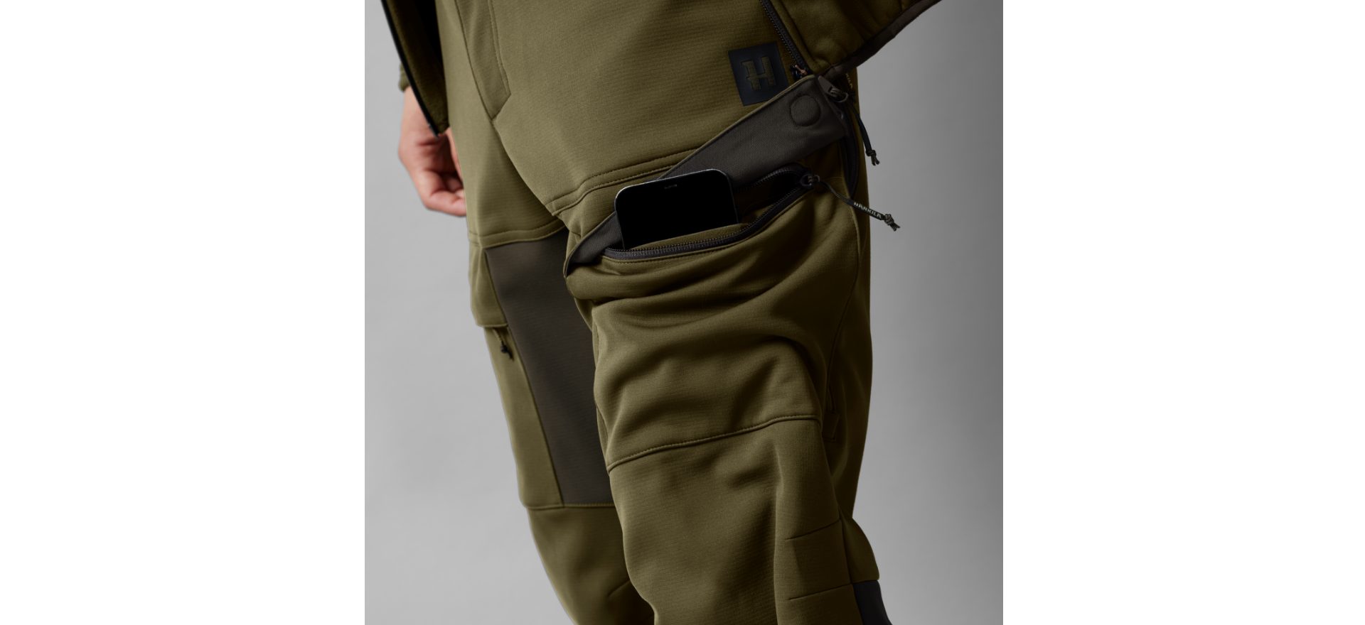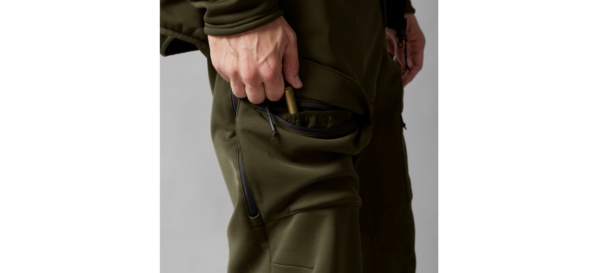 Prawa kieszeń ma uchwyt na cztery dodatkowe naboje, a lewa kieszeń – przegrodę na telefon komórkowy, która zapobiega jego przemieszczaniu się podczas podchodzenia