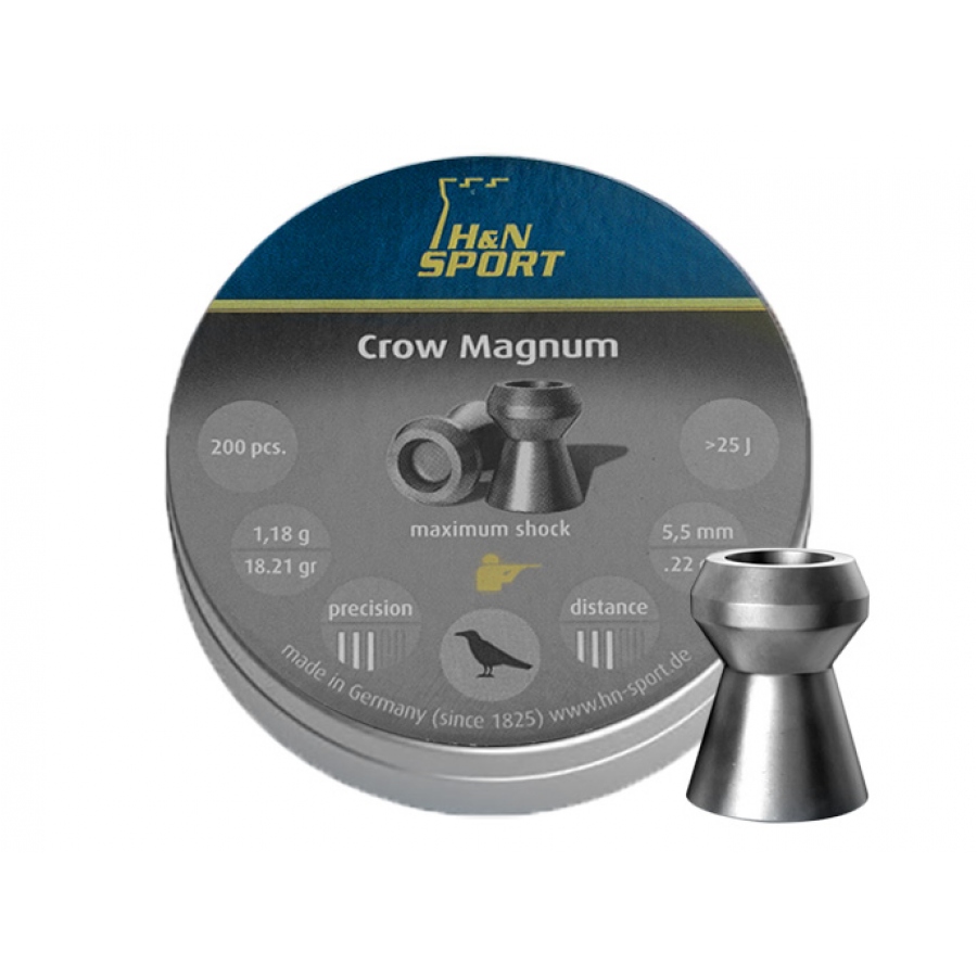 Śrut Crow Magnum Diabolo 5,5 mm – śrut rozrywający o ponadprzeciętnej wadze, gładkość oraz staranność wykonania sprawia że jest bardzo celny. Śrut różni sie tym od Halow Pointa, że ma szerszy otwór z przodu (jeszcze większy efekt w rozrywaniu) oraz jest cięższy.