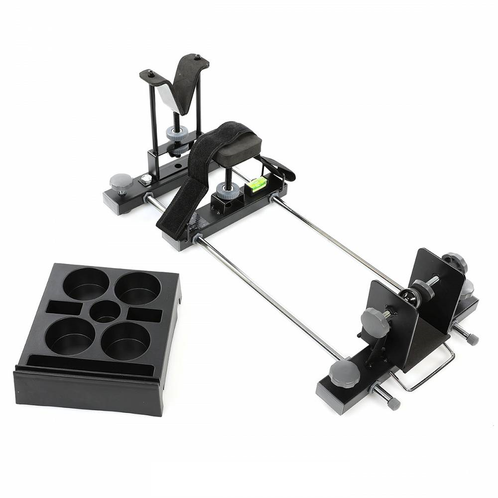 Znakomita podpora strzelecka pozwalająca na ustawienie przyrządów celowniczych mechanicznych lub optycznych. Rozbudowany system regulacji o sporym zakresie pracy umożliwia dokładne ułożenie brony wedle potrzeb strzelca i warunków na torze. Dodatkowym atutem urządzenia jest koszyk na akcesoria czyszczące broni dzięki któremu może z powodzeniem może zastąpić ono imadło do czyszczenia broni.