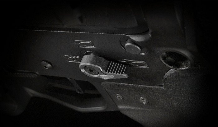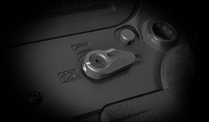 Obustronny selektor ognia przeznaczony do karabinków AR-15 cechujący się zwiększoną w stosunku do klasycznego selektora powierzchni kontaktu z palcem.