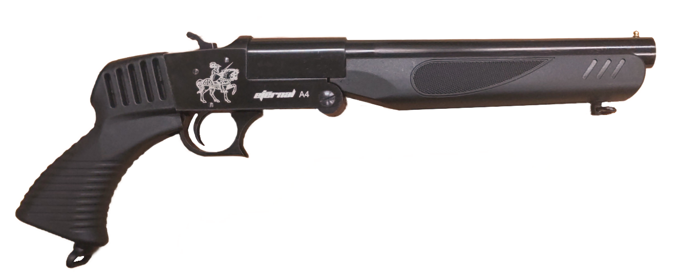 Strzelba ta to nasz autorski pomysł na tanią i nietypową broń do zabawy. Lekka, jednostrzałowa strzelba kalibru 12. Mocny nabój i niska masa broni to mocny odrzut. Strzelba akceptuje amunicję do 12/76 włącznie, ale nie polecamy jej używania, odrzut może uszkodzić nadgarstek. Polecamy amunicję 21g lub 24g.