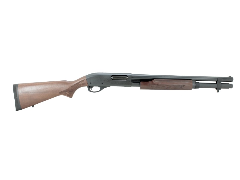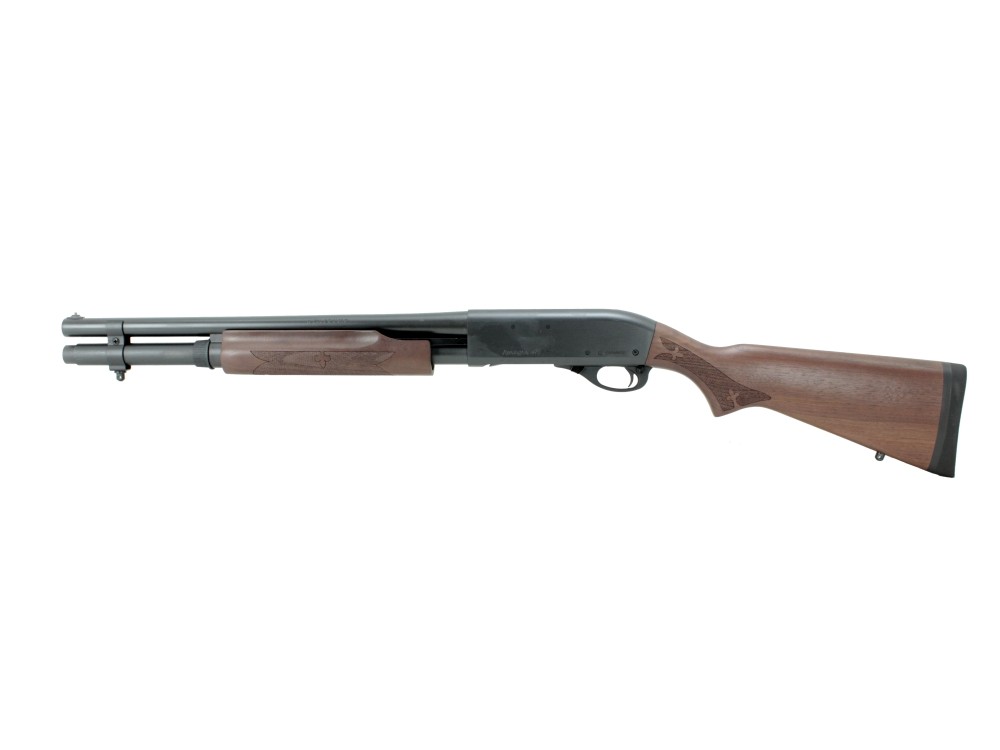 Legendarna strzelba Remington 870, ze stalową komorą zamkową. Uważana jest za najbardziej wytrzymałą strzelbę systemu “pump action”. Została opracowana w latach pięćdziesiątych XX wieku i wciąż znajduje się na wyposażeniu wielu służb ochrony prawa. Używa jej także policja i siły zbrojne USA.