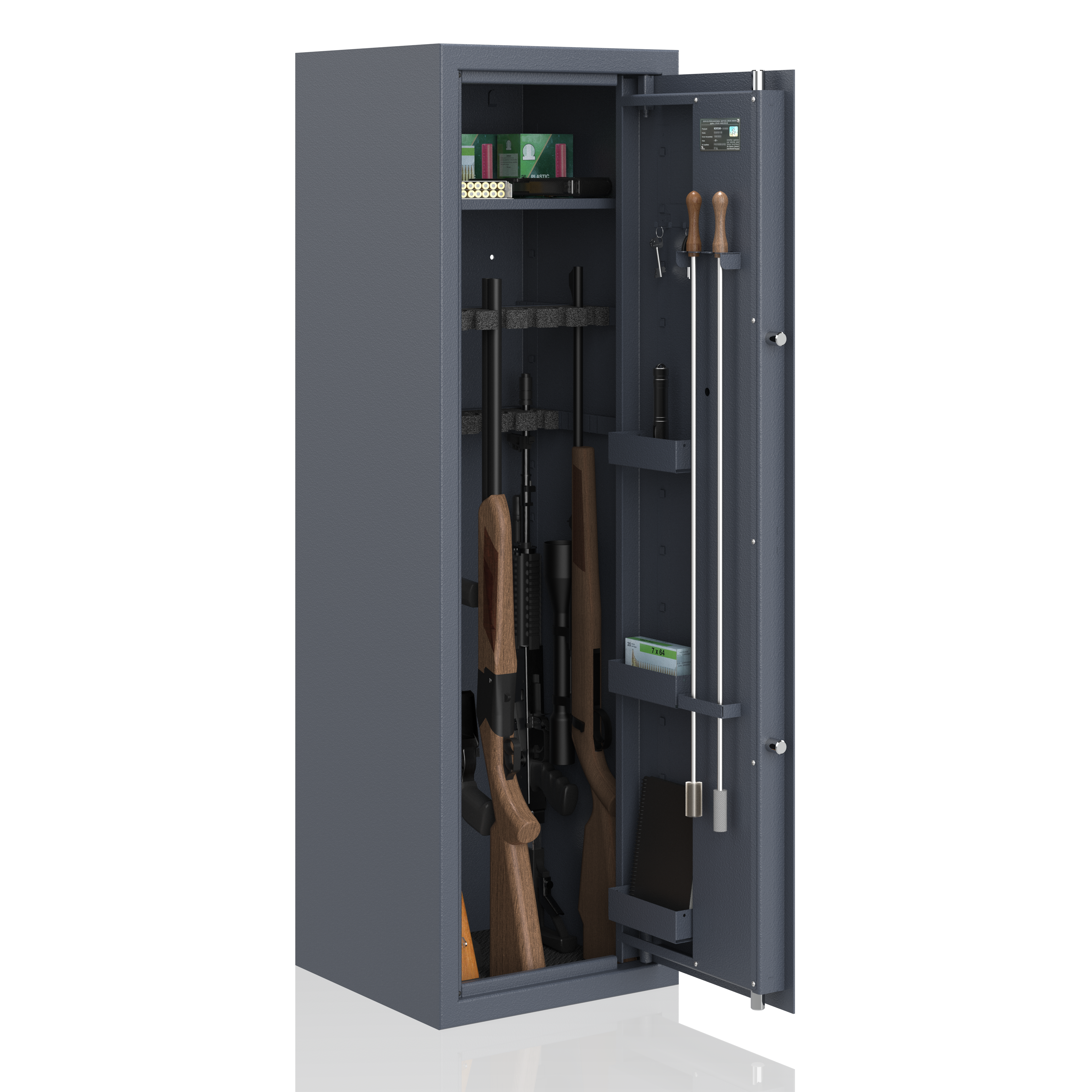 Szafa pomieści 14 jednostek broni (uchwyty regulowane pionowo i poziomo), ma praktyczne wyposażenie drzwi oraz standardowy zamek klasy A (2 klucze 65 mm) z opcją późniejszej wymiany na zamek elektroniczny.