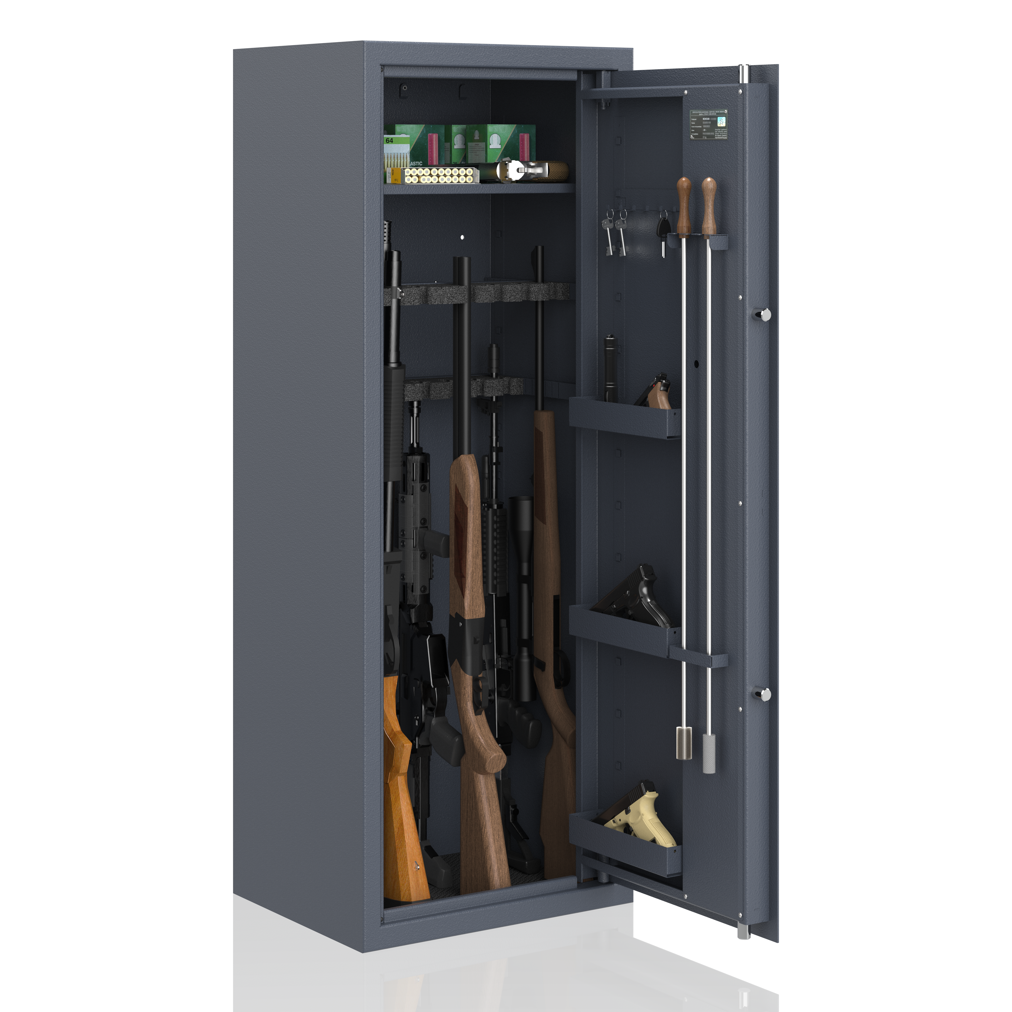 Szafa oferuje 16 uchwytów na broń, regulację wnętrza oraz praktyczne wyposażenie drzwi. Standardowo zamykana zamkiem klasy A (2 klucze 65 mm), z możliwością późniejszej modernizacji do zamka elektronicznego. Estetyczny grafitowy kolor (RAL 7024) sprawia, że szafa dobrze wpasuje się w różne aranżacje.