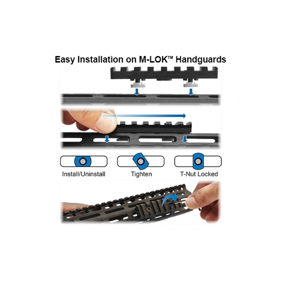Montaż szyny jest bardzo prosty i można go przeprowadzić samodzielnie w kilkanaście sekund. W zestawie stalowa śruba, nakrętka M-LOK oraz klucz imbusowy.
