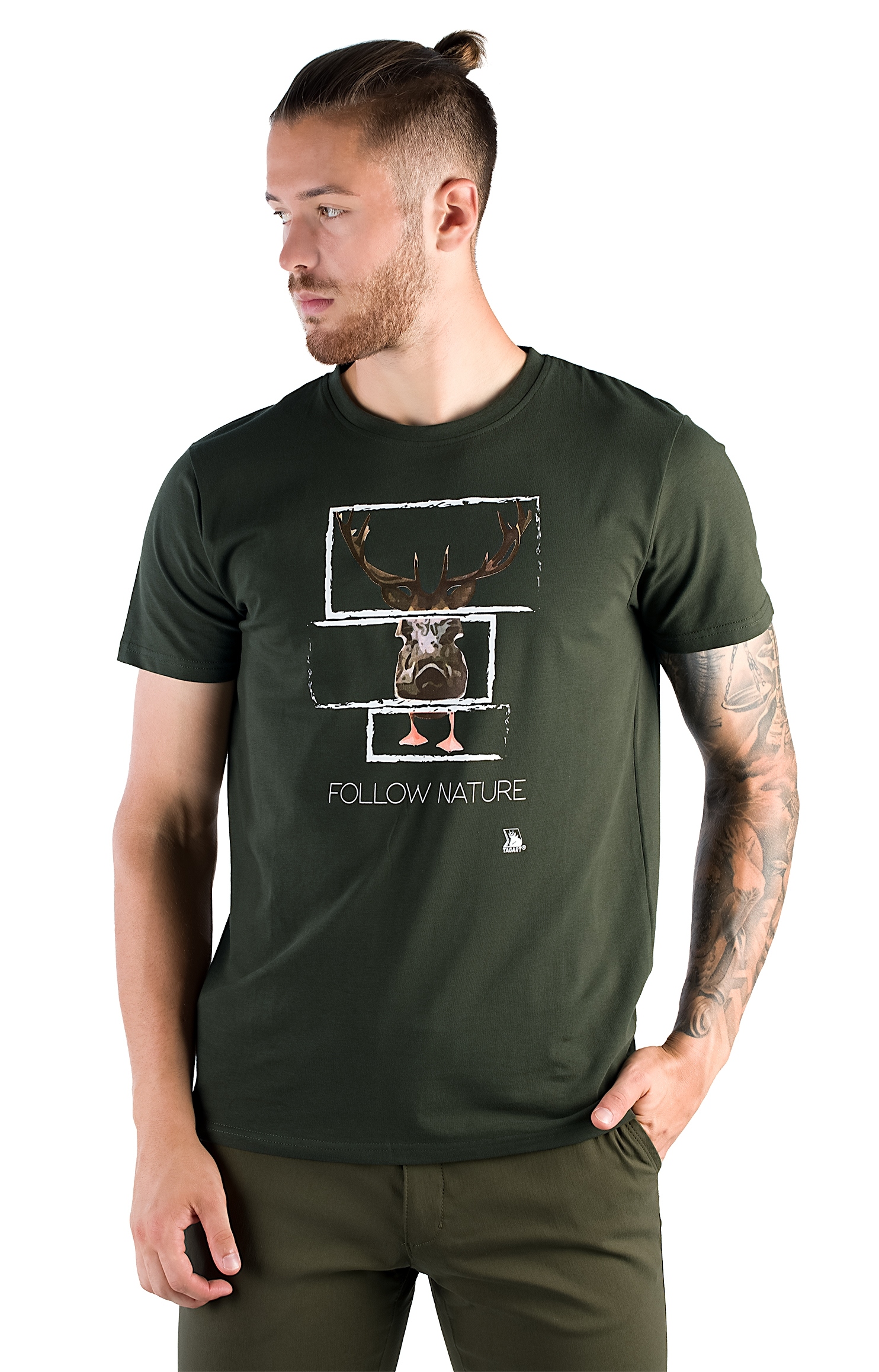 Ciemnozielony kolor świetnie wpisuje się w klimat outdoorowych aktywności – od wędrówek po łowiska, po relaks przy ognisku. Uwagę przyciąga oryginalny nadruk przedstawiający zaskakującą hybrydę trzech zwierząt – jelenia, dzika i kaczki – w formie lekkiego żartu, który nieco rozluźnia klasyczny, myśliwski styl.