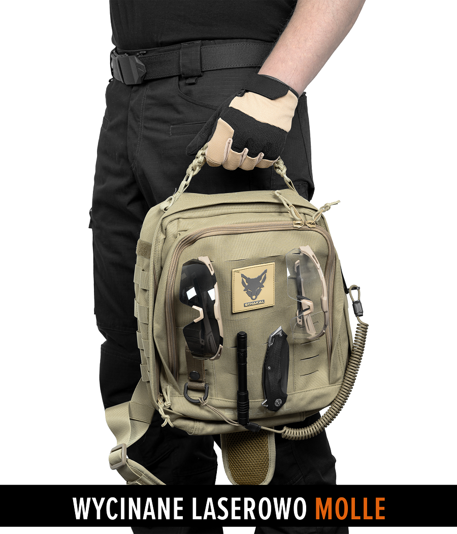 Zewnętrzna strona torby oferuje system MOLLE, który pozwala na indywidualną rozbudowę – zgodnie z Twoimi potrzebami. Dodatkowy panel Velcro z dołączonym patchem serii Schakal nadaje torbie charakteru i podkreśla jej taktyczne przeznaczenie.