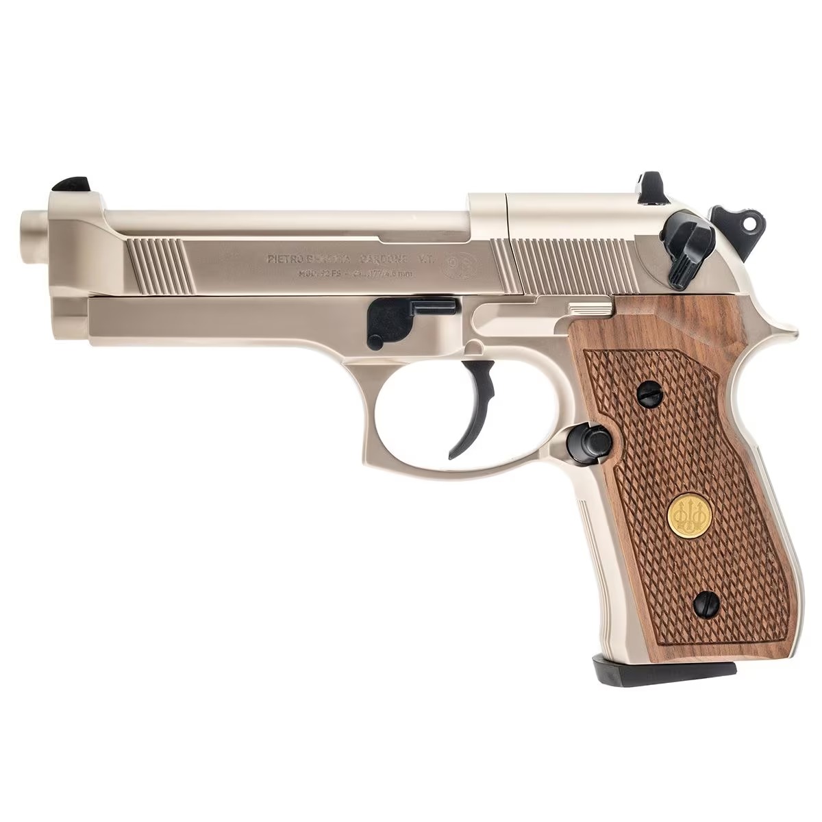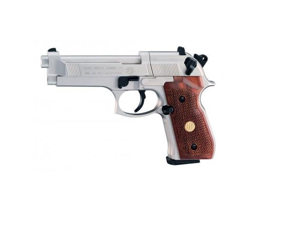 Beretta 92FS to licencjonowana, wysokiej klasy wiatrówka CO₂, wiernie odwzorowująca legendarny model włoskiej broni palnej. Dzięki pełnej metalowej konstrukcji, ergonomicznej rękojeści z drewnianymi okładzinami oraz gwintowanej lufie zapewnia wyjątkową celność i doskonałe wrażenia.
