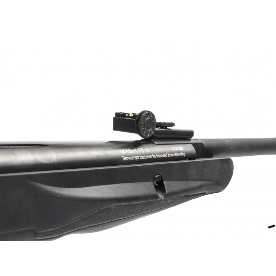 Wiatrówka sprężynowa Browning M-Blade. Polimerowa obudowa lufy zapewnia nietuzinkowy wygląd. Gumowany chwyt poprawia komfort trzymania. Pionowa i pozioma regulacja muszki.