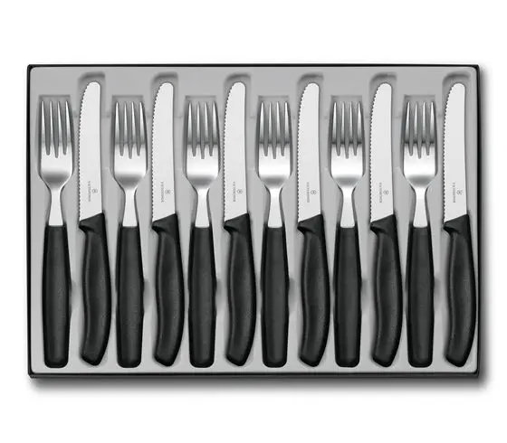 Sztućce – zaraz po kucharzu – to papierek lakmusowy każdej kuchni. Wybierz ich odpowiedni zestaw, a sprawdzą się podczas niezliczonych uczt, przetrwają wiele cykli mycia oraz ułatwią cięcie i krojenie szerokiej gamy dań i produktów – skutecznie i bezszelestnie. Zestaw stołowy Swiss Classic zachwyca pod każdym względem: formy, funkcjonalności i trwałości. Ten 12-elementowy zestaw stołowych niezbędników obejmujący wysokiej jakości noże i widelce sprawdzi się zarówno na co dzień, jak i na specjalne okazje.
